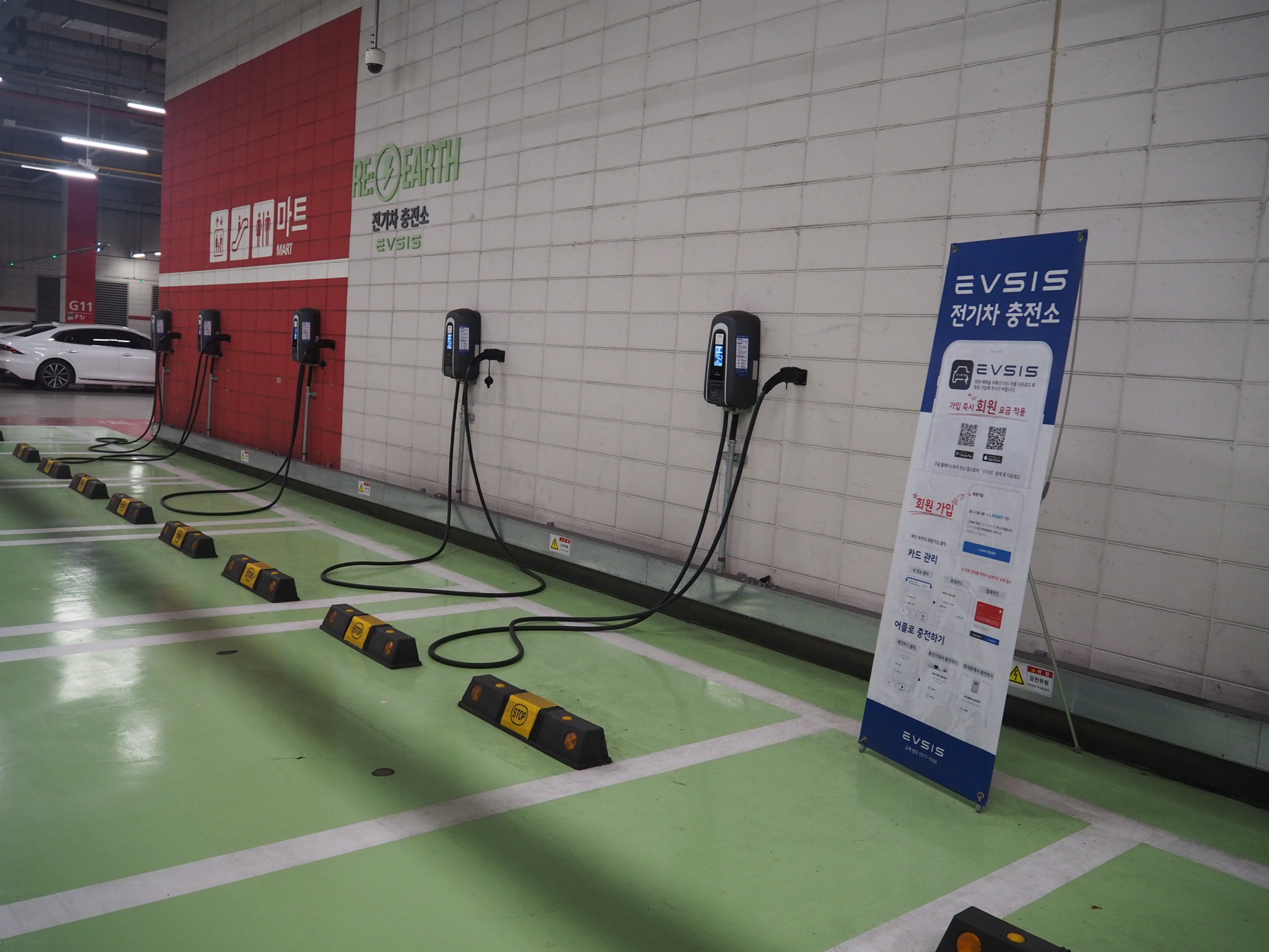 마트입구쪽에 이렇게 또 충전기가 많이 있으나 일반차량이나, 충전안하는 차들도 주차해둔 경우 있어서 메인쪽에 충전하길 권유