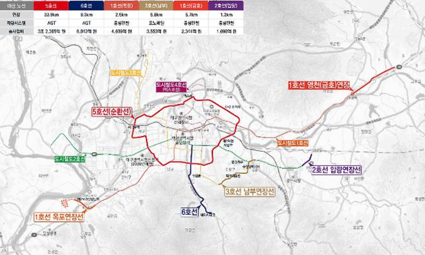 이번에 공개된 5호선은 총연장 33.9km의 순환선 개념으로, 대구의 주요 6개 구를 통과합니다.